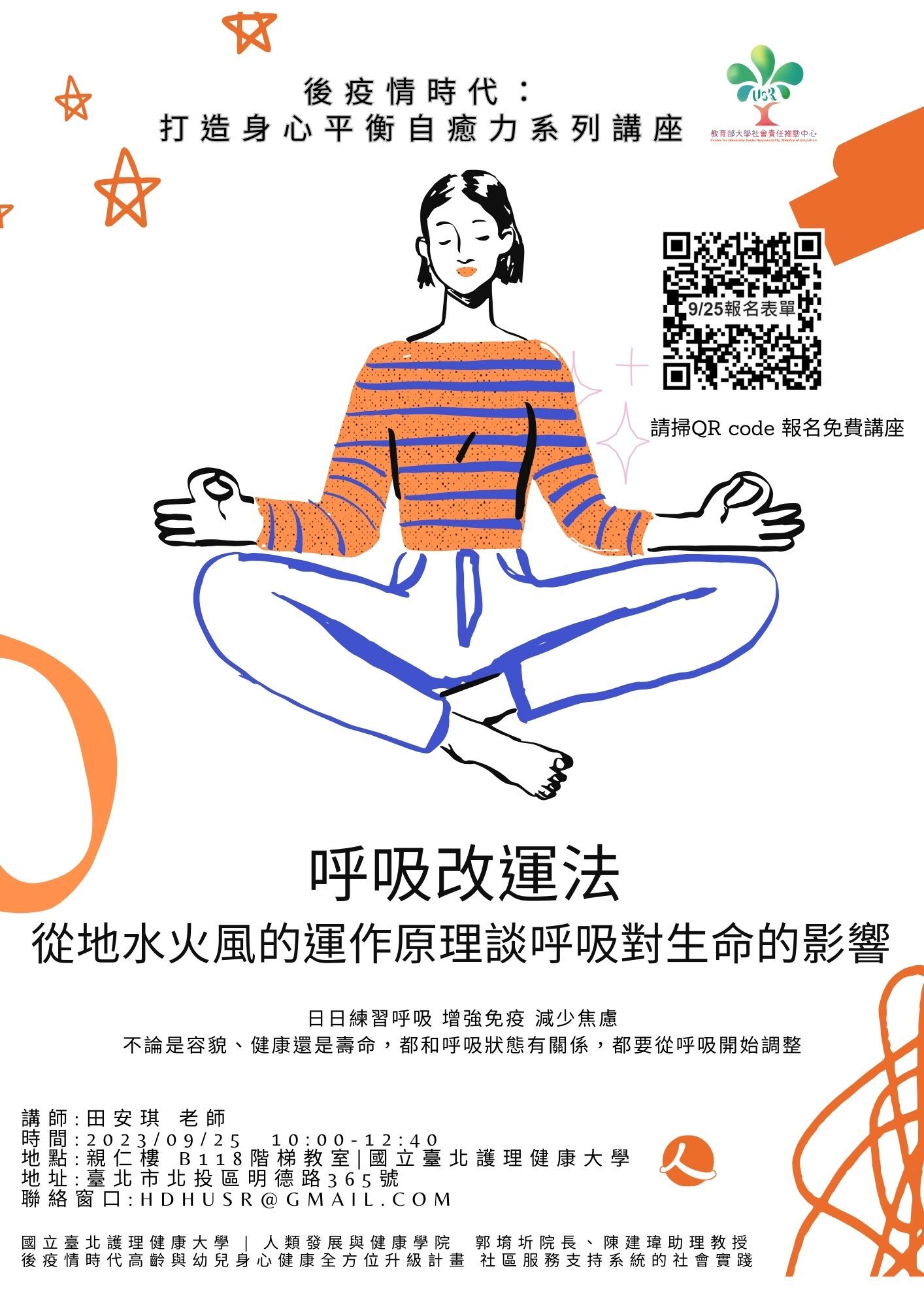 【活動】人康學院USR計畫 | 9/25呼吸改運法|從地水火風的運作原理談呼吸對生命的影響 | 後疫情時代:打造身心平衡自癒力系列講座